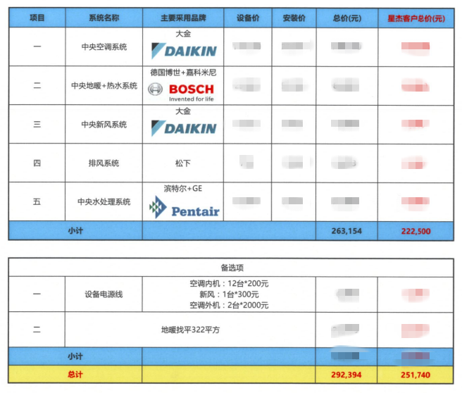 家居集成系統(tǒng):大金VRV-P中央空調(diào)系統(tǒng)   大金新風(fēng)系統(tǒng)  松下排風(fēng)扇 博世歐洲之星鍋爐   嘉科米尼地暖管路系統(tǒng)    濱特爾中央水處理  威樂循環(huán)泵