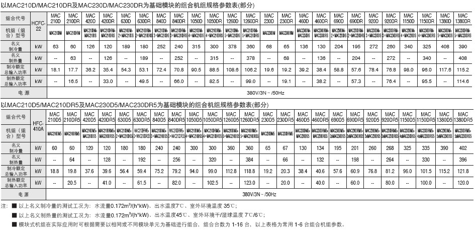 型號:MAC210DR~MAC3360DR MAC230DR~MAC3680DR 制冷量:60~1088kW 制熱量:63~1088kW 熱回收量: 制冷劑:HFC-410A HCFC-22