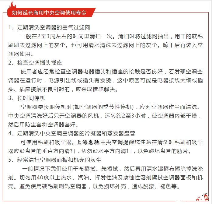 我們都經常見到中央空調,商場、超市等等大型場所,不同于家用小型中央空調,商用中央空調需要馬力十足。大家都知道商用中央空調實用的時間比較長。那么,如果在這么長的時間內保證商用中央空調的制冷、制暖效果應該如何做呢?接下來惠馳小編就來給大家簡單介紹一下商用中央空調有哪些分類以及如何延長商用中央空調使用壽命。